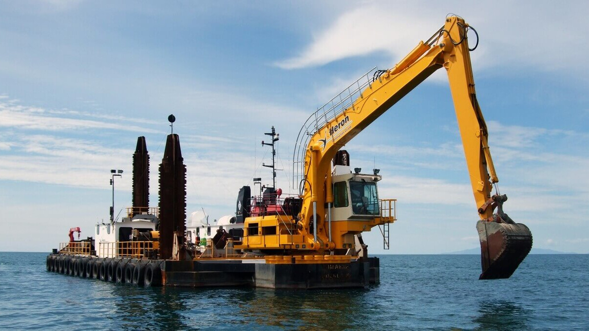 Pontoon equipped with a hydraulic excavator that excavates the soil and discharges it into a split hopper barge.