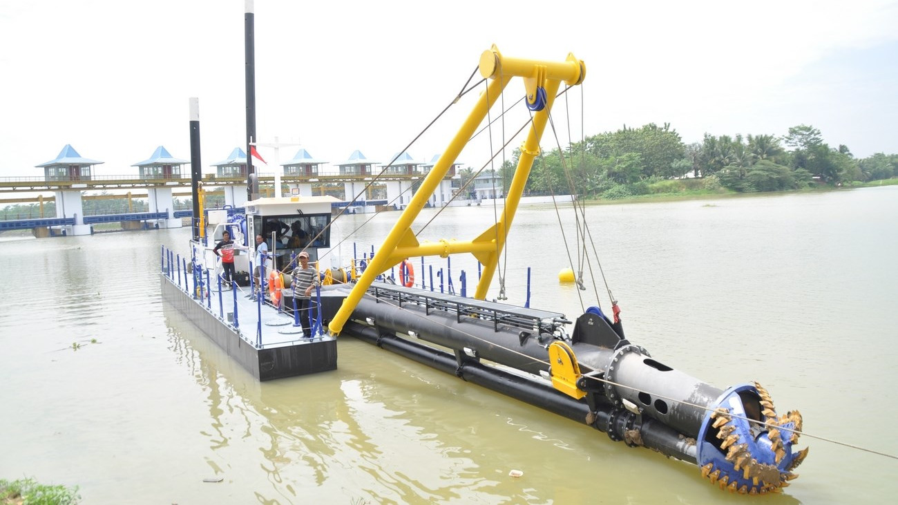 Dredger cutting hard soil into fragments with a rotating cutter head. The material is sucked up by dredge pumps and discharged at a deposit area through floating pipelines.